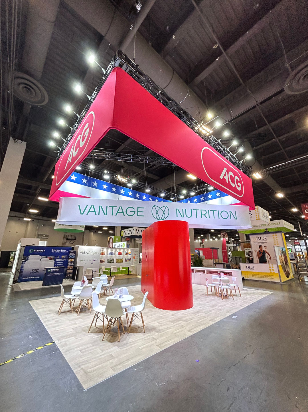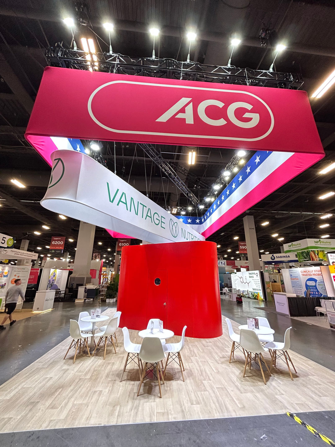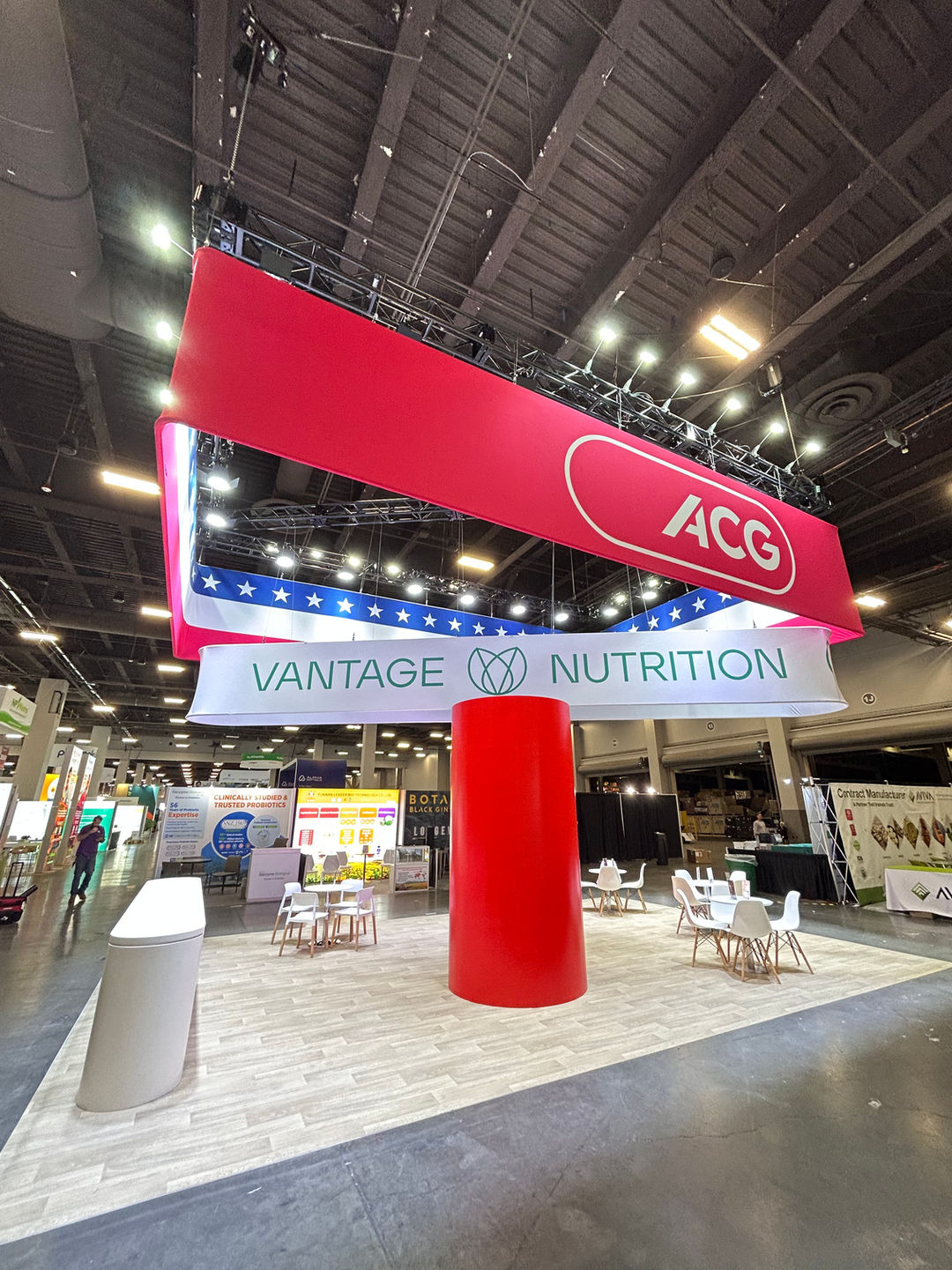 The booth features a large, open-concept design defined by a massive, square red hanging banner with the ACG logo, making it highly visible across the expo hall. Below it, another banner highlights Vantage Nutrition, an ACG Group company, and features a patriotic American flag motif, emphasizing its US presence. The space is designed for client consultation, with numerous meeting tables and a striking central red pillar.