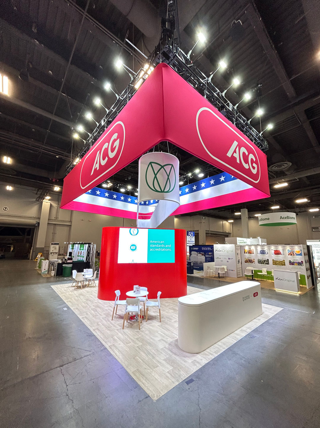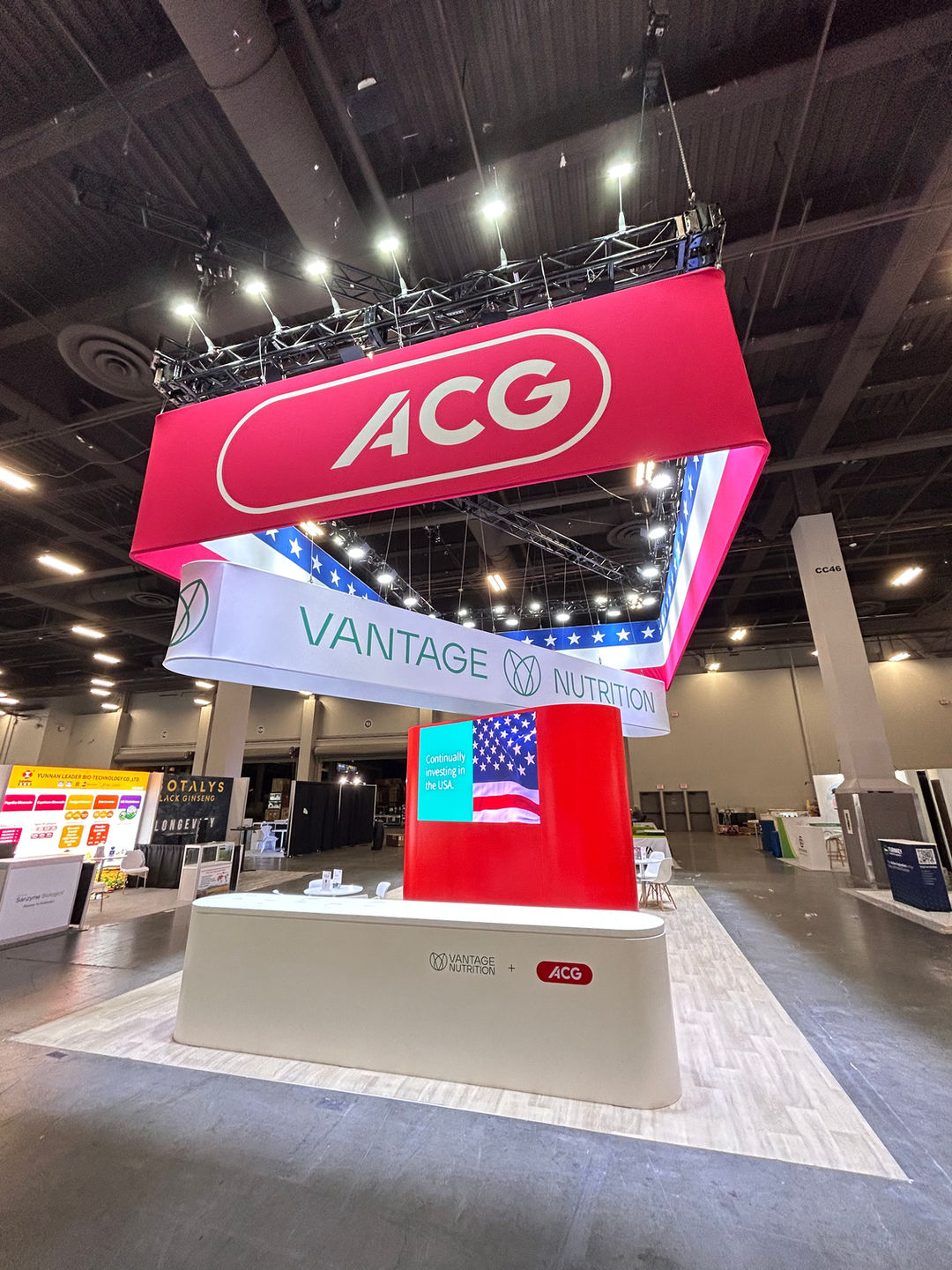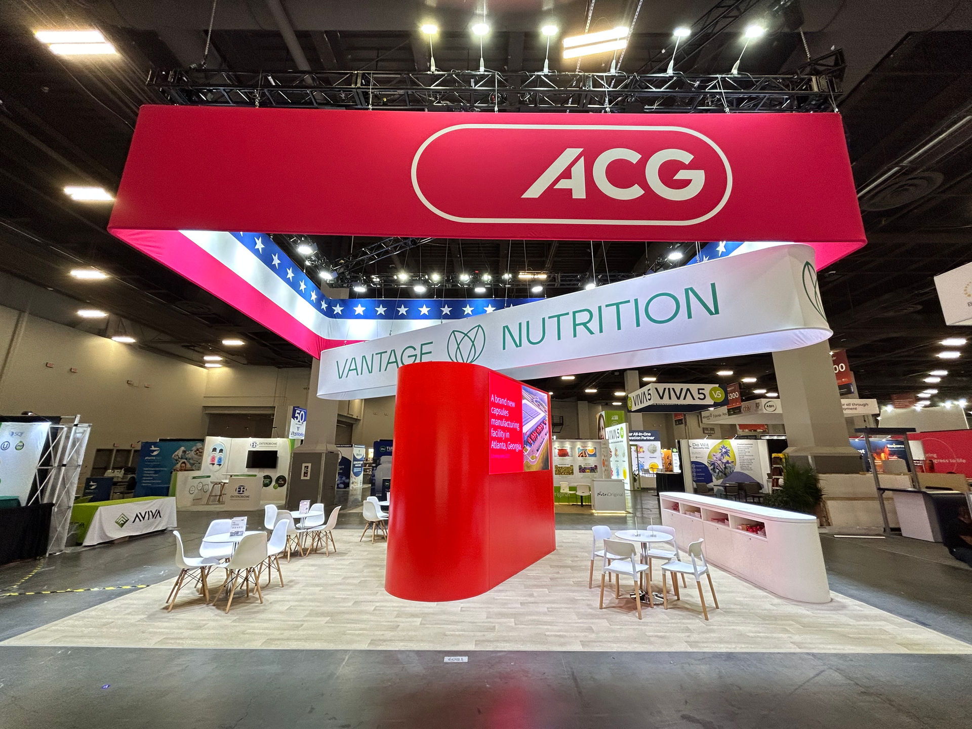 The booth features a large, open-concept design defined by a massive, square red hanging banner with the ACG logo, making it highly visible across the expo hall. Below it, another banner highlights Vantage Nutrition, an ACG Group company, and features a patriotic American flag motif, emphasizing its US presence. The space is designed for client consultation, with numerous meeting tables and a striking central red pillar.