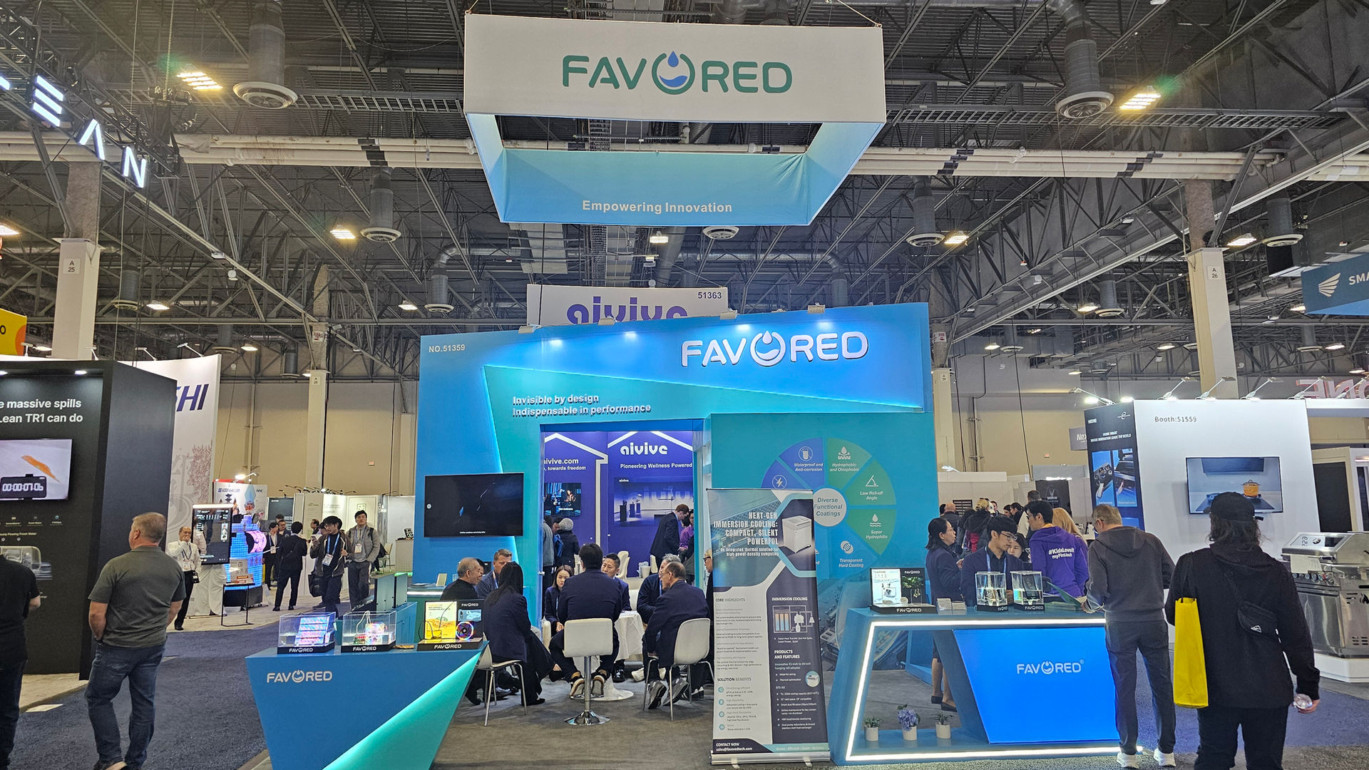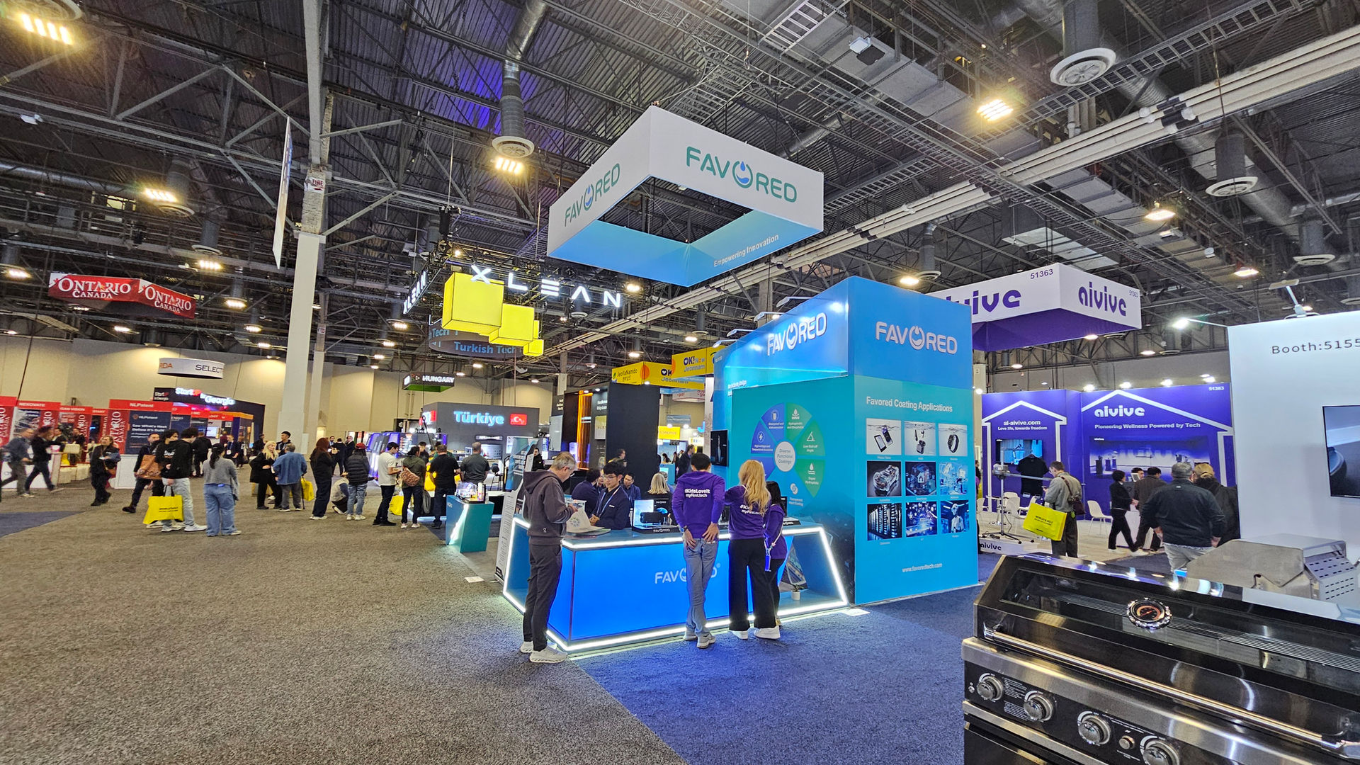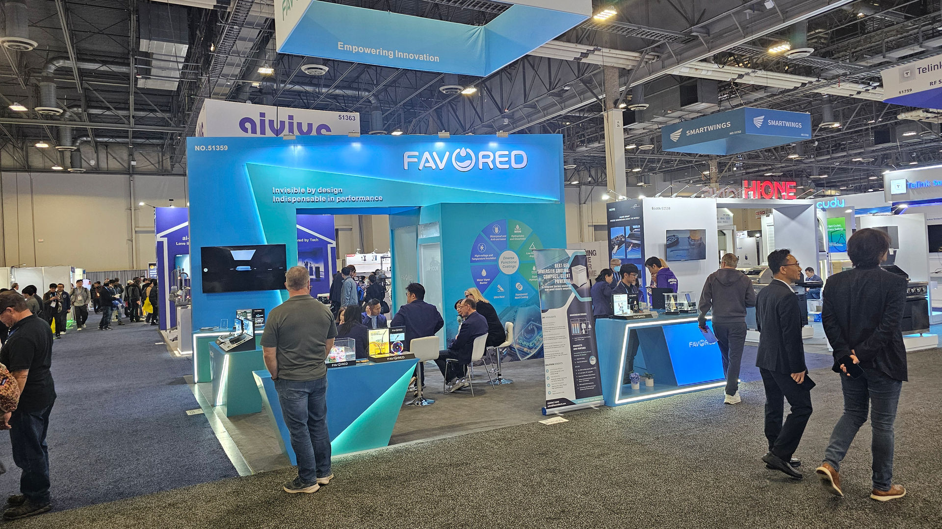 At CES 2026, the FAVORED booth stands out as a bold and immersive brand statement, designed and executed by KOTLA USA. The space features a striking overhead hanging sign combined with a dynamic, angular booth structure, creating strong visibility from multiple aisles. A clean blue gradient palette, integrated LED lighting, and illuminated counters reinforce FAVORED’s innovation-driven identity. The open layout encourages seamless visitor flow, while dedicated meeting areas and product display zones support meaningful conversations and technology demonstrations. Every detail—from architecture to lighting—was carefully crafted to deliver a modern, premium, and future-forward exhibition experience.