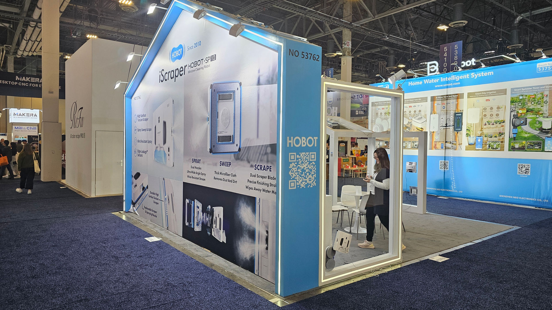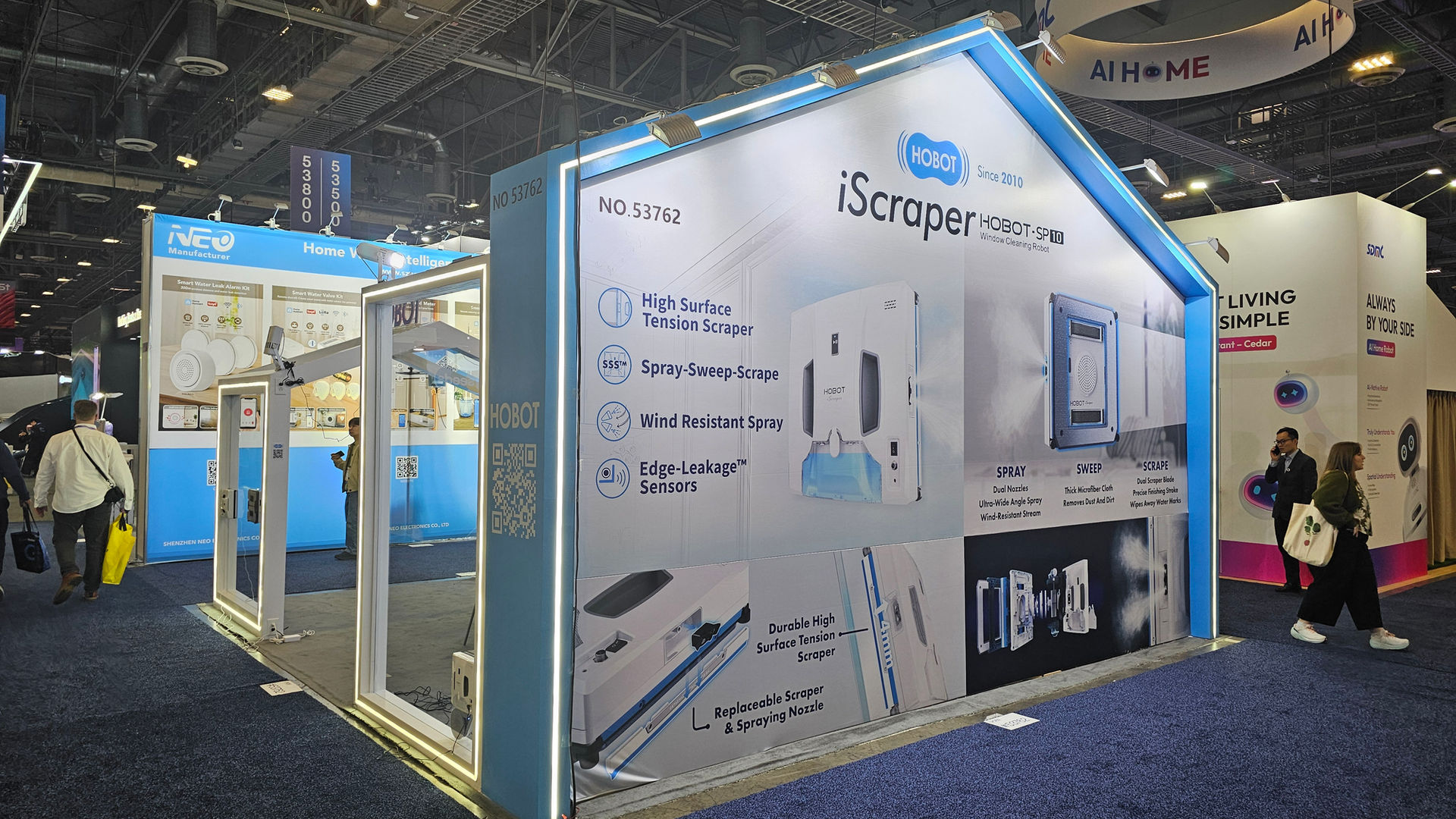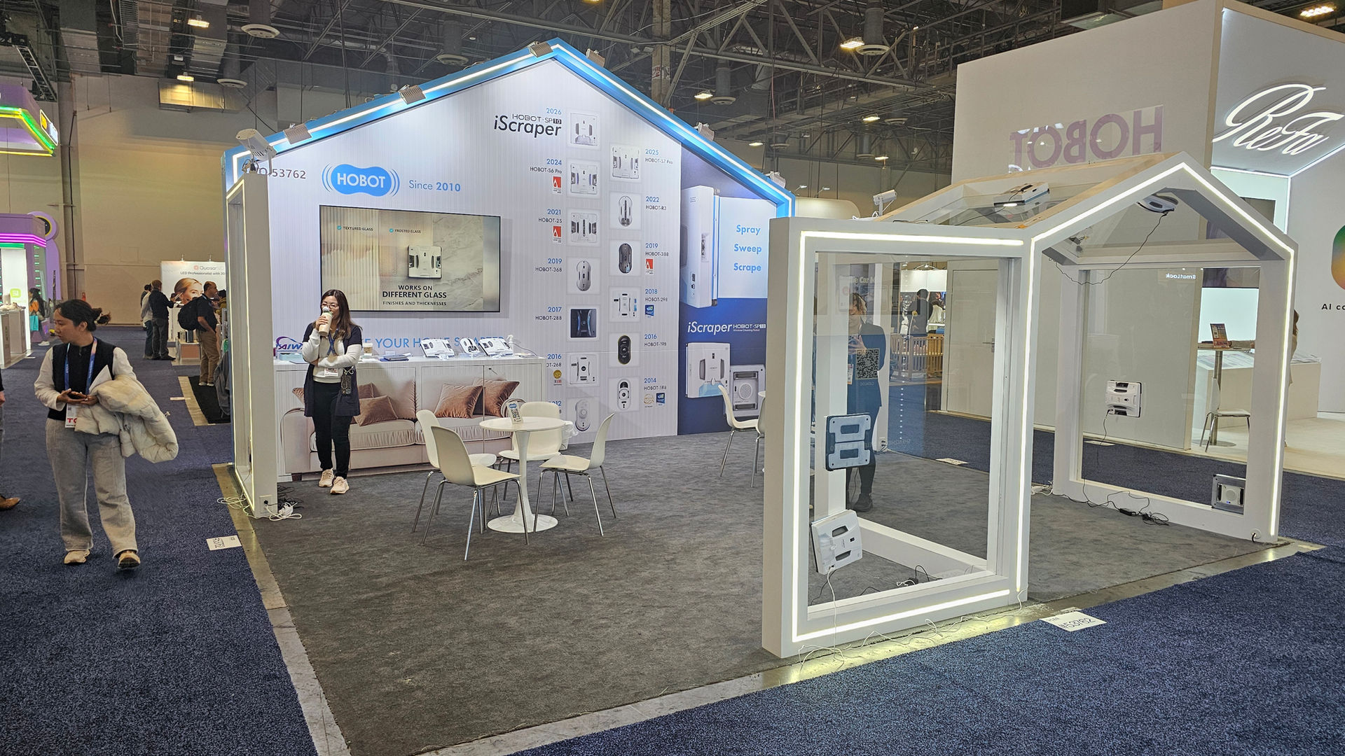 At CES 2026, the HOBOT booth showcases a bright, technology-driven exhibition space that highlights the brand’s leadership in smart robotic cleaning solutions. Designed and built by KOTLA USA, the booth features a house-inspired structure with clean white finishes and soft blue LED accents, symbolizing smart living, reliability, and innovation.