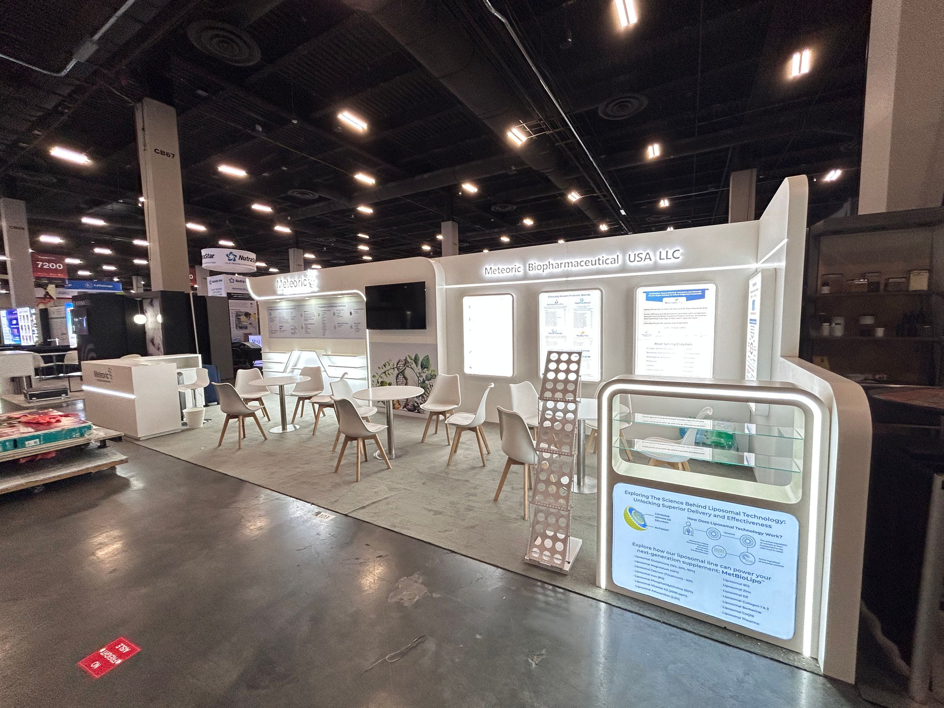 About Meteoric Biopharmaceutical Meteoric Biopharmaceutical is a research-driven company specializing in high-quality enzymes, probiotics, and innovative delivery systems for the nutraceutical industry. As highlighted prominently in the booth's graphics, their key focus is on advanced science and technology, particularly their proprietary "Soma-Method Liposomal Technology." This technology is designed to significantly enhance the bioavailability and effectiveness of nutrients, a key selling point in the supplement market.