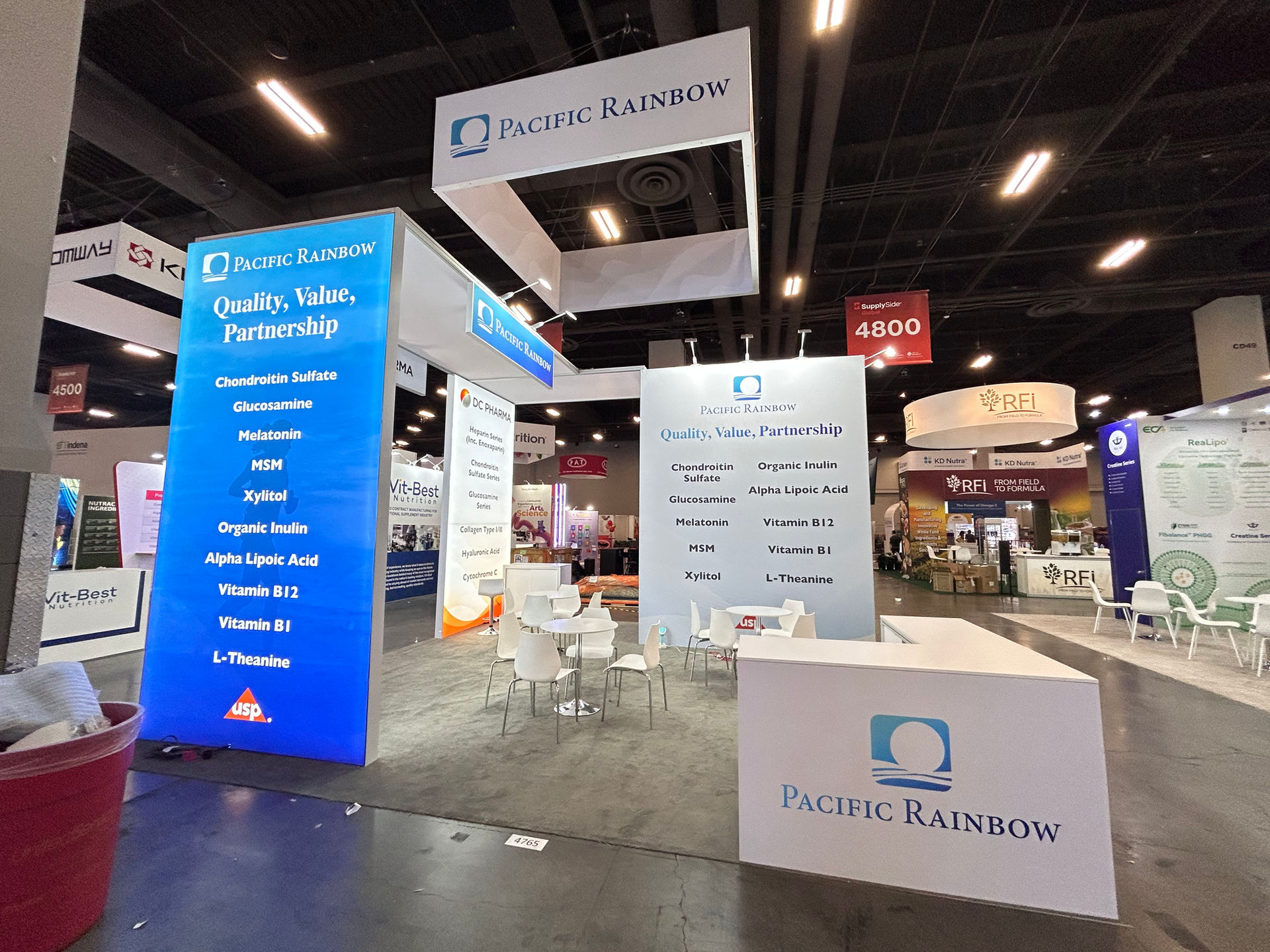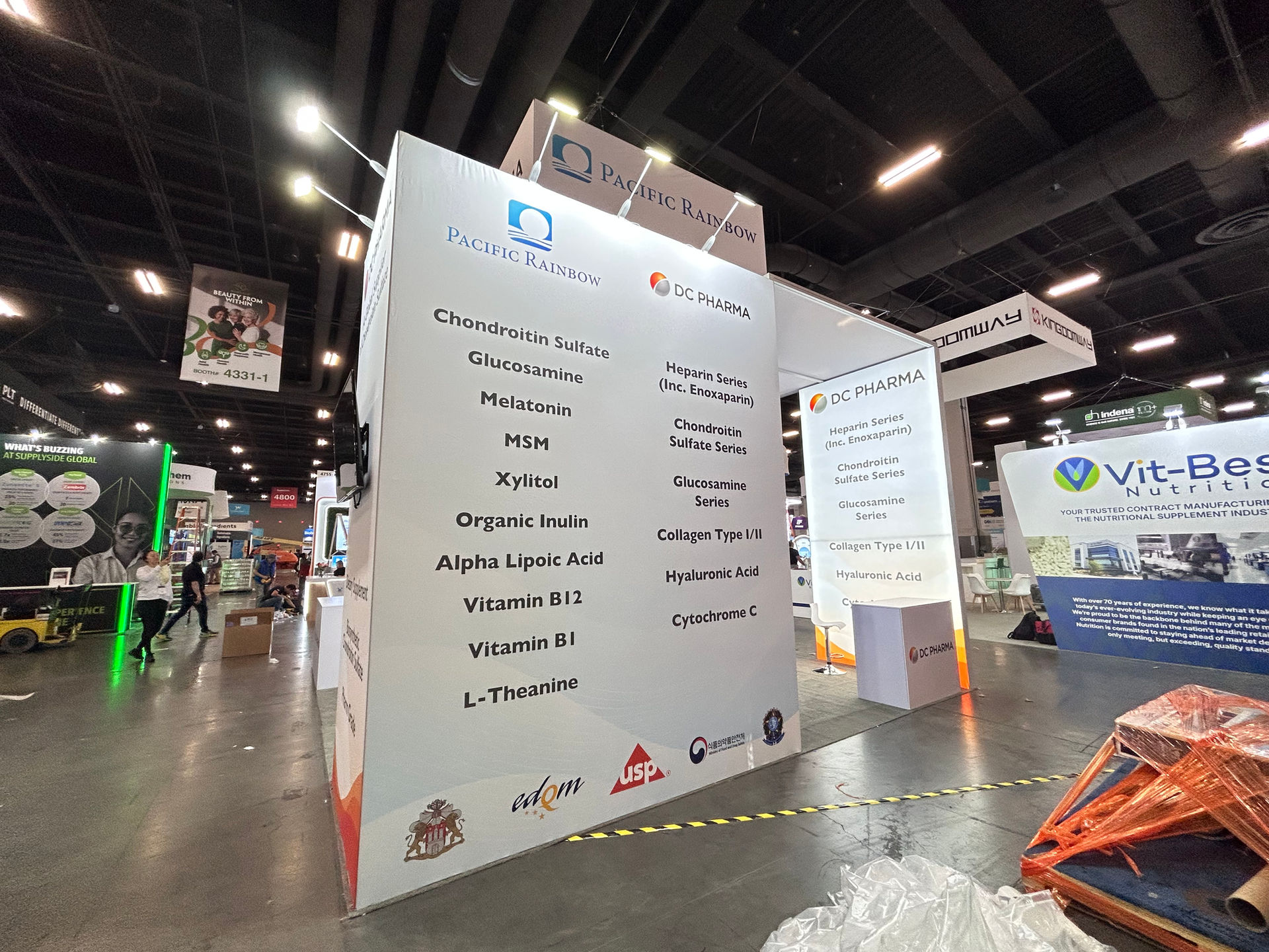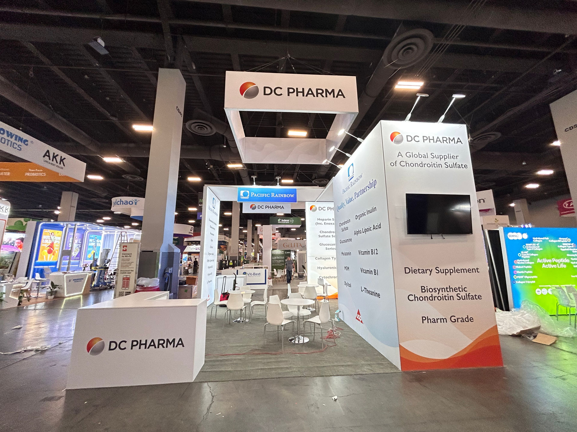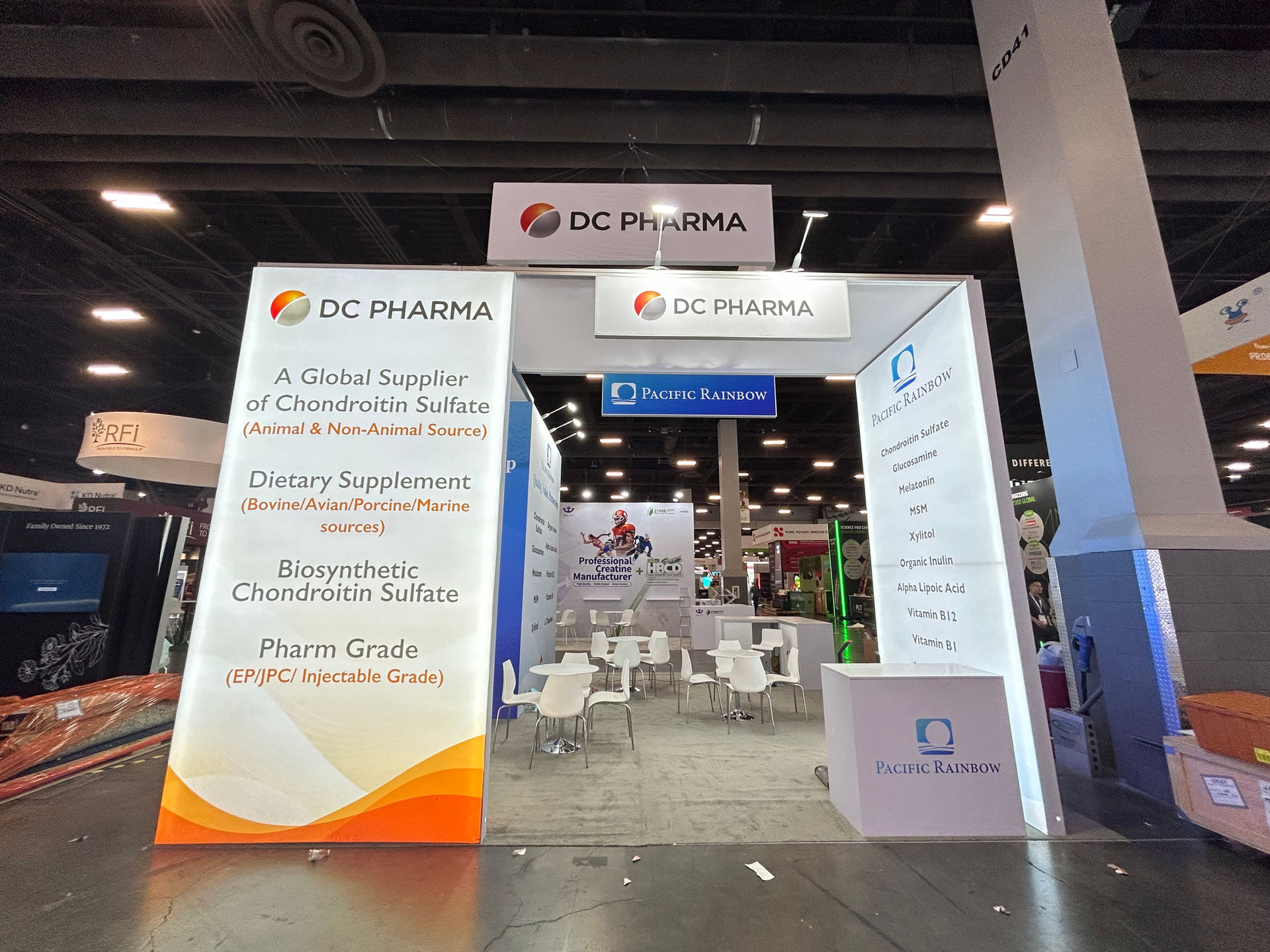 About PACIFIC RAINBOW / DC PHARMA Pacific Rainbow is a leading global supplier of high-quality raw materials for the dietary supplement and pharmaceutical industries. As seen on the booth's display, their product line includes a wide range of in-demand ingredients such as: