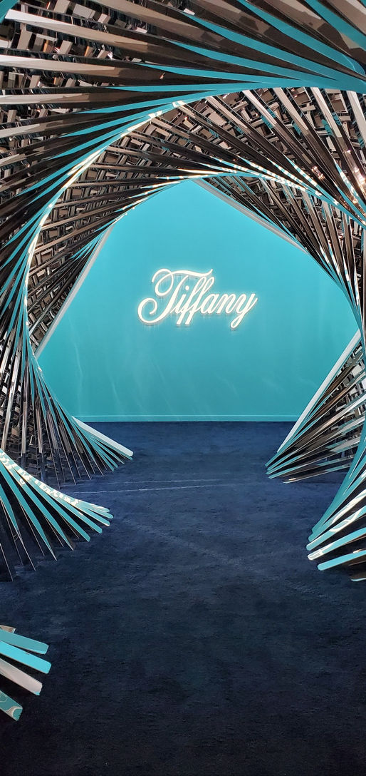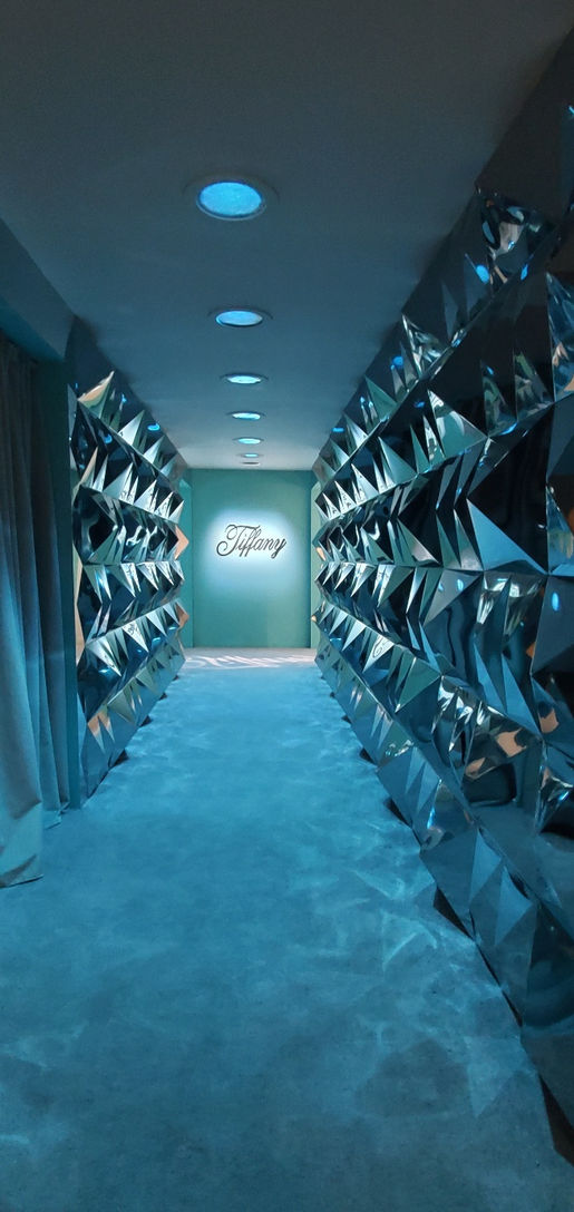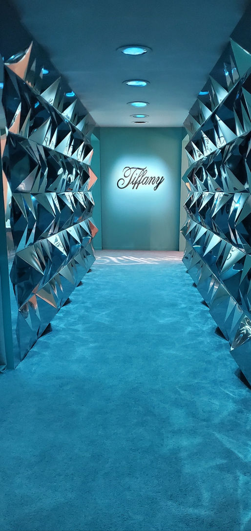 An Artistic Journey Begins: Guests entered through a luxurious corridor designed with Tiffany’s iconic blue hues and diamond-inspired reflections, setting the stage for an immersive brand experience.