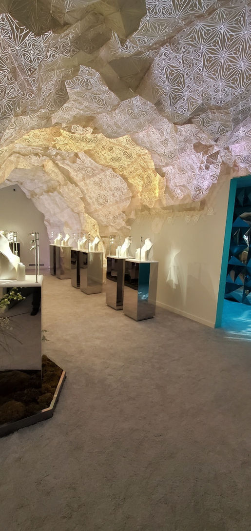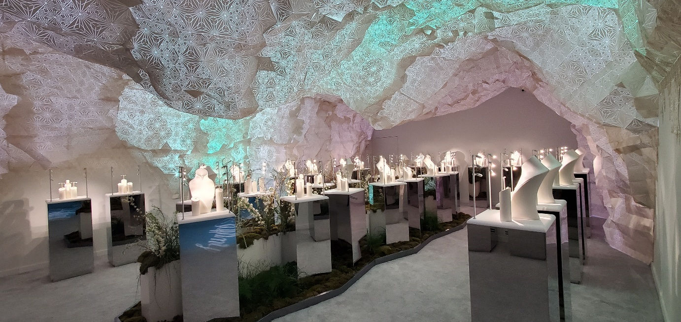 Showcasing the Collection: The Tiffany Spring 2023 pieces were presented on minimalist yet refined pedestals, with precision lighting designed and operated by Kotla USA to enhance every detail of craftsmanship.